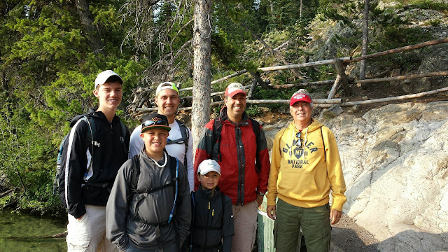 Big hike day. Dad joined the Willoughbys for a boat ride across Jenny Lake and a hike to Hidden Falls and lookout called Inspiration Point. Then through cascade canyon. We left the little ones and Dad (wohp returned to the lodge for a swim...) for a big person hike up a hill over snow covered trails, a detour around a broken bridge, and a rise of 2400 ft. The reward was a beautiful half frozen lake, a cold foot falling through a frozen path, and the most work I have ever done on vacation. 9 hours and 15 miles later we made it back to the van sore but satisfied. Passed an old German couple who made it all the way to the lake despite my dad's old goat geezer comment to then early in the hike that we had trouble remembering the exact quote. Dad slept in the tent instead of in the hotel to experience the camping experience and make leaving early a little easier. Celebrated after the hike at the dinner in the lodge with free cake and singing to the almost birthday boy...c